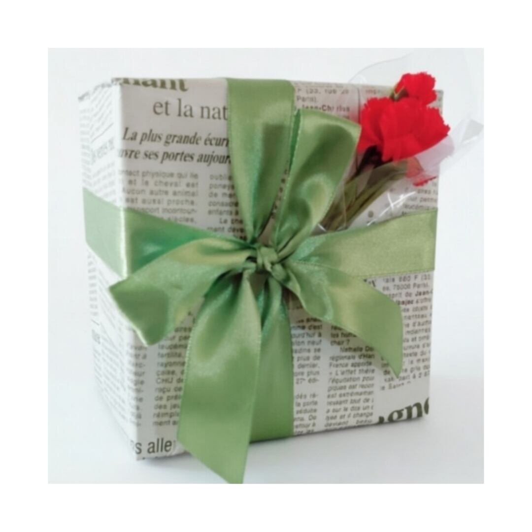 アーティフィシャルフラワーのカーネーションをお付けしたラッピングです。ギフトとしての美しさを引き立てるため、丁寧に包装紙で包みこみ、心温まるひとときを演出いたします。※包装紙とリボンのみのラッピングは無料です。