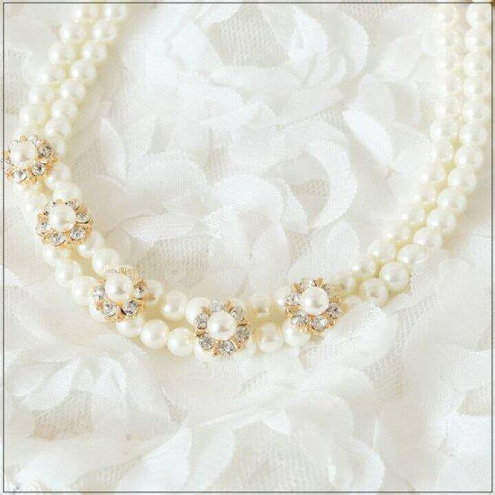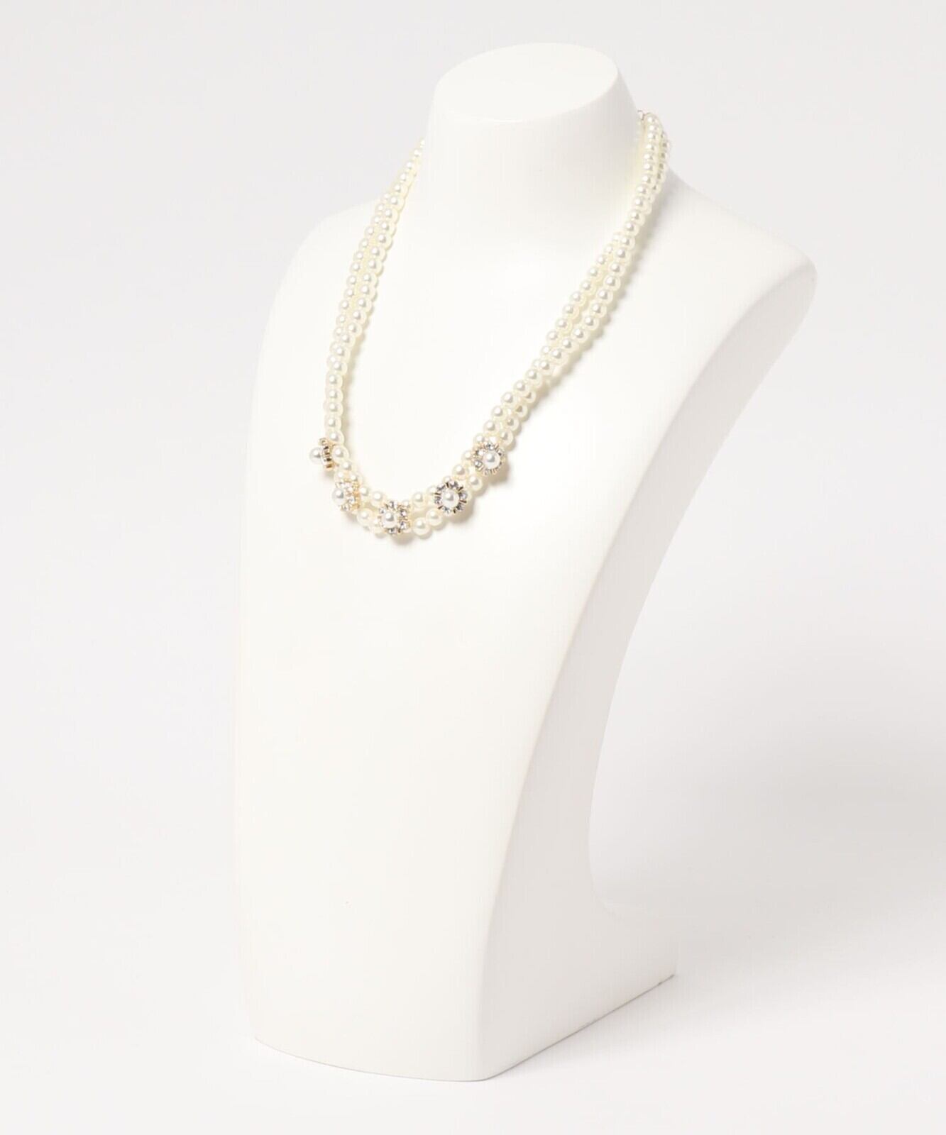 プチフラワーのモチーフが可愛いチョーカーデザインの2連パールネックレスです。ラインストーンとパールを使用したフラワーモチーフが大人可愛い雰囲気。ネックラインを選ばず、フォーマルシーンにぴったりなネックレスです。