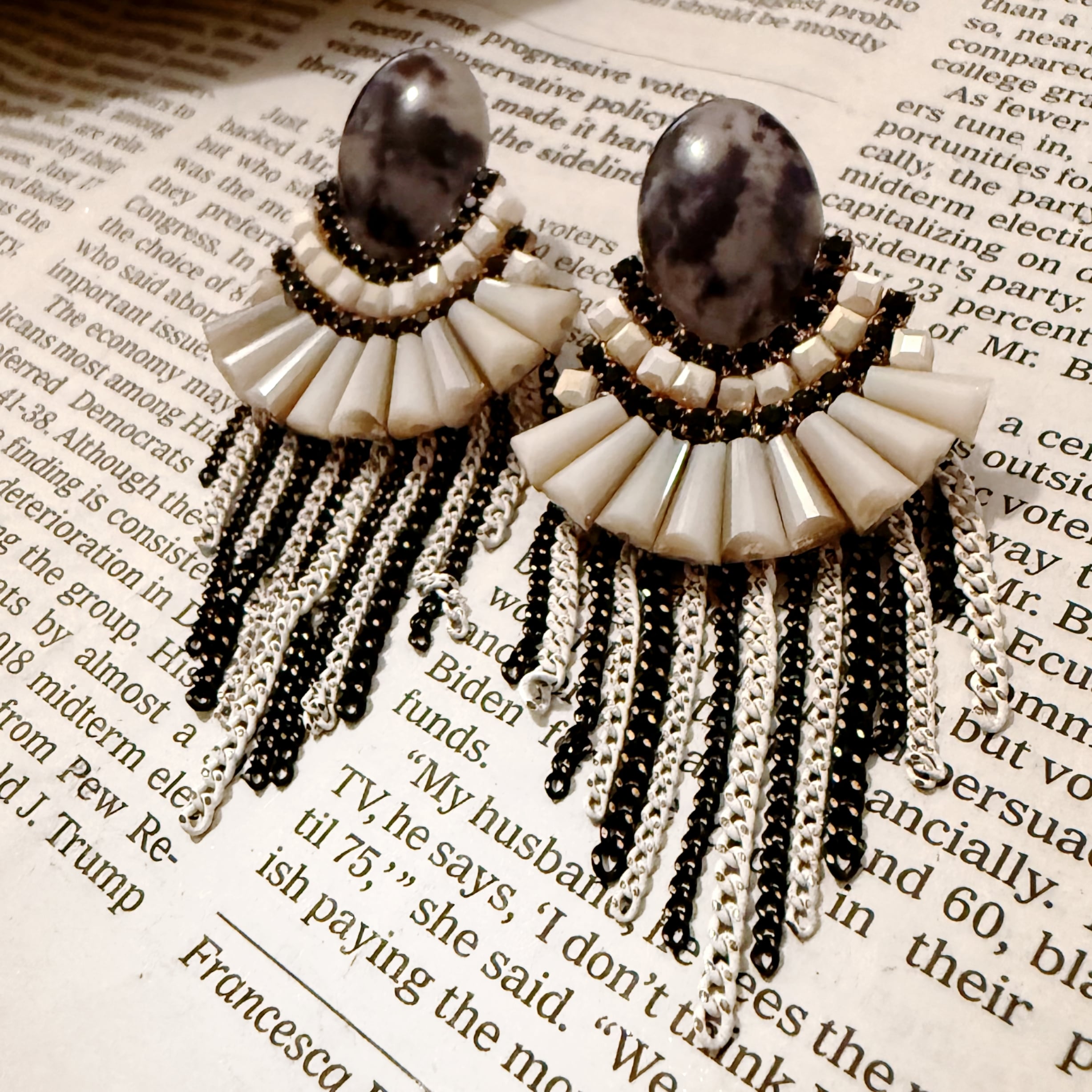 フリンジのデザインが特徴のおおぶりのピアスです。