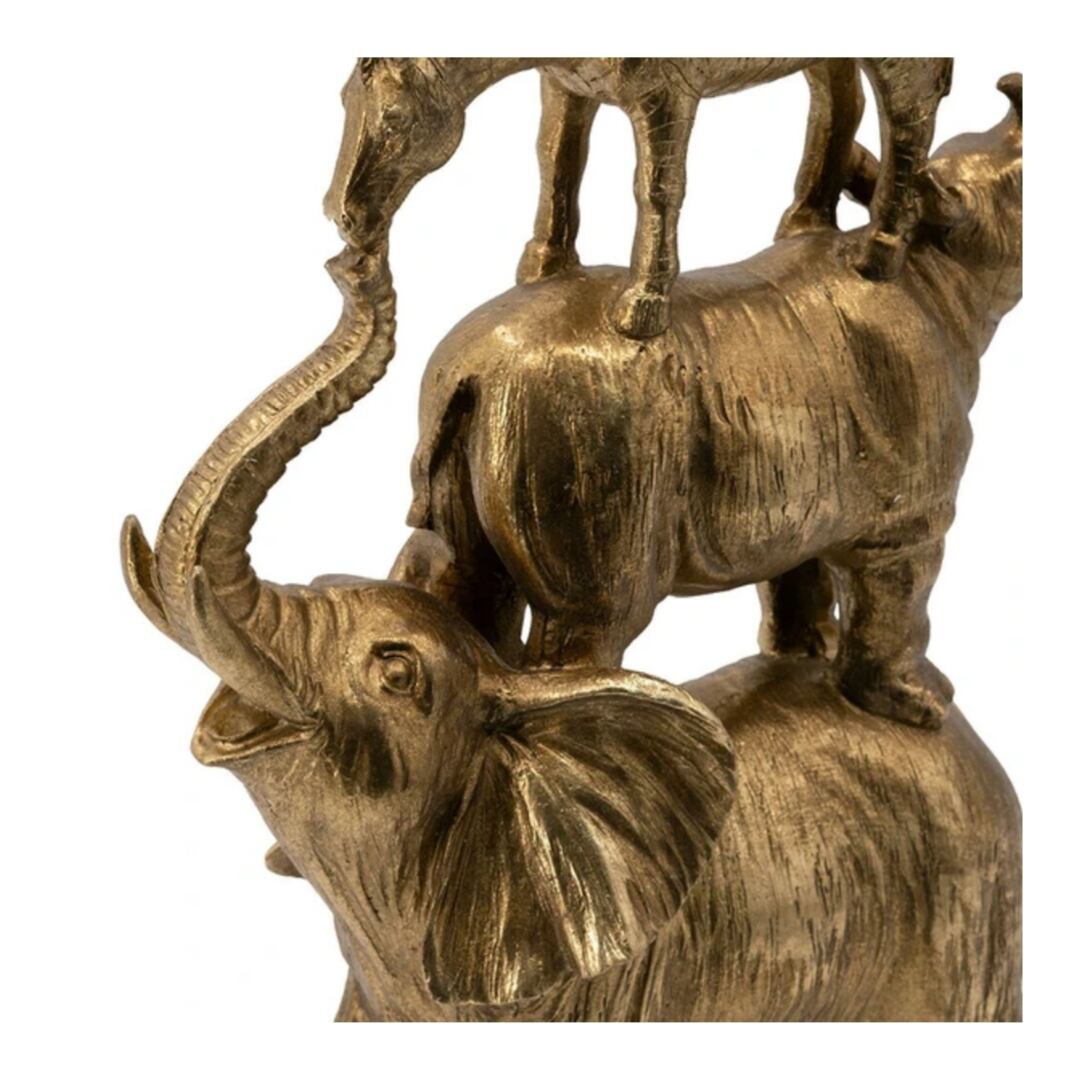 象・サイ・シマウマがユーモラスに積み重なる姿をかたどった、アンティークゴールド仕上げのアニマルオブジェ。