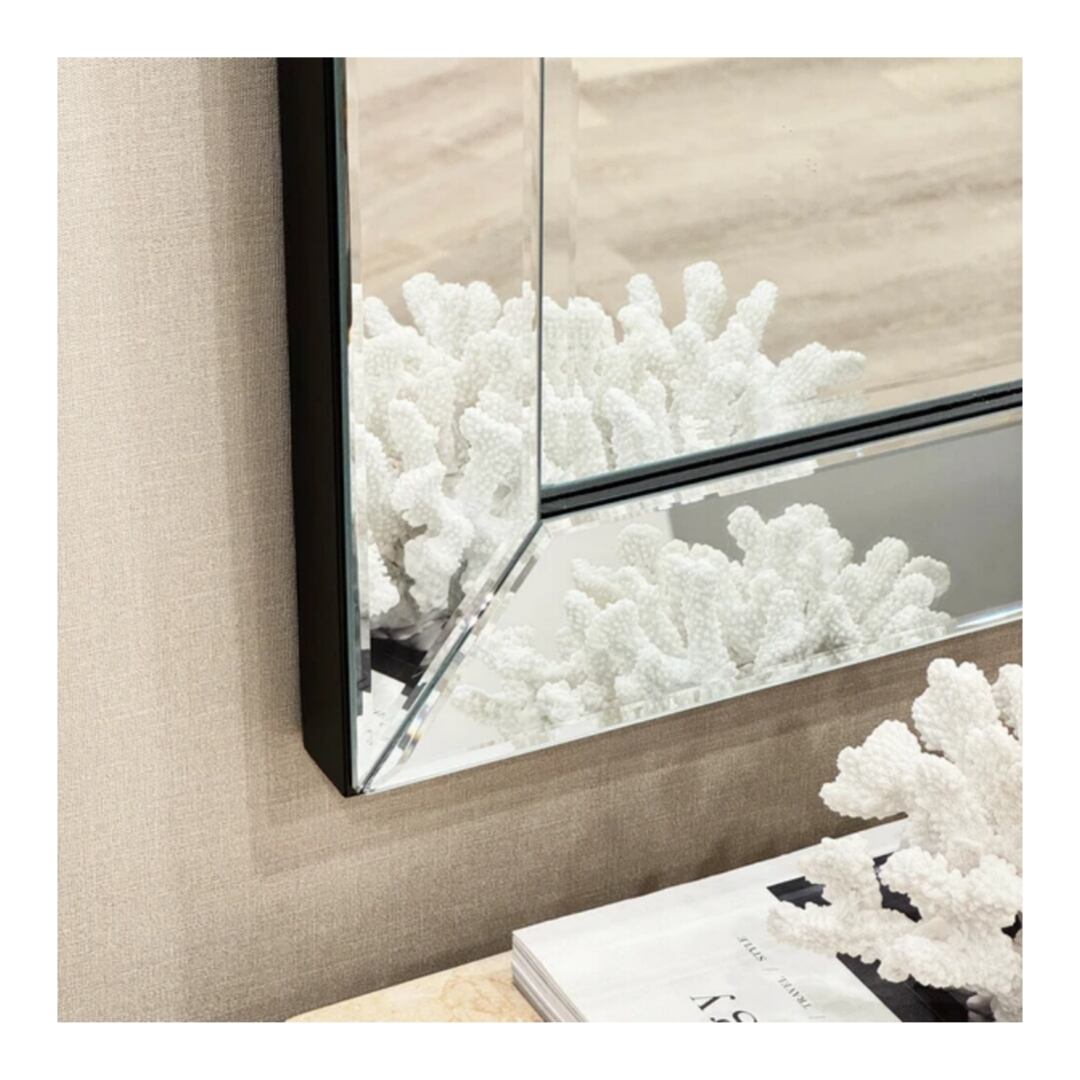 ミラーのフチは立体的な面取り加工が施されており、光をやわらかく反射しながらも、空間全体を引き締めてくれます。ブラックのサイドラインが現代的な印象を加え、シンプルながらも洗練された印象にしてくれます。