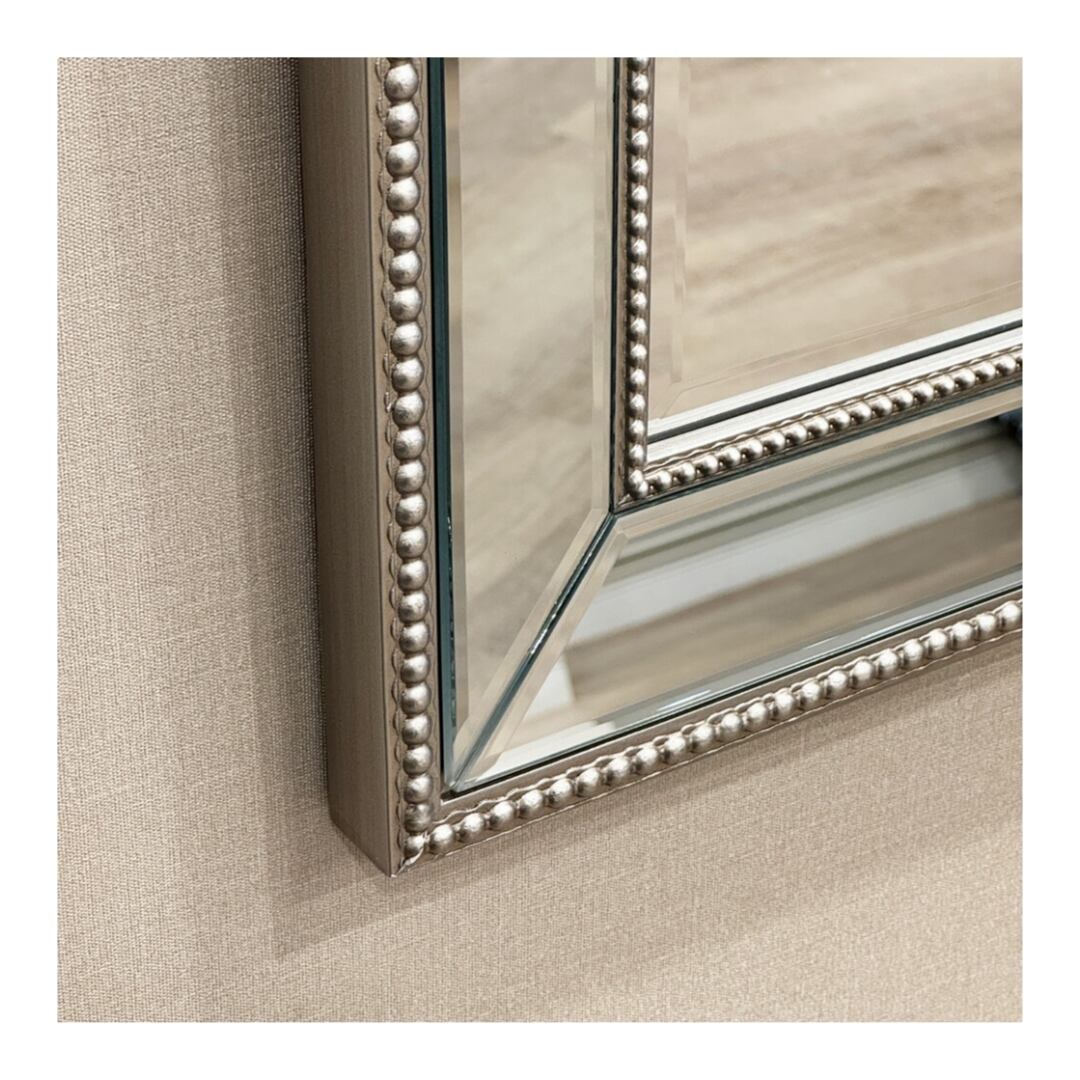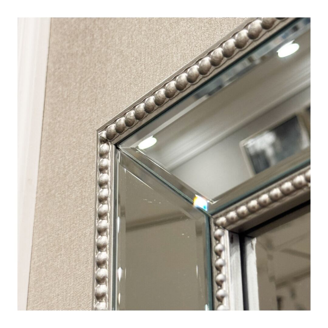 立体的なビーズ装飾と柔らかなシルバーのフレームが空間にほどよい華やかさを添える、縦長タイプの壁掛けミラー。
