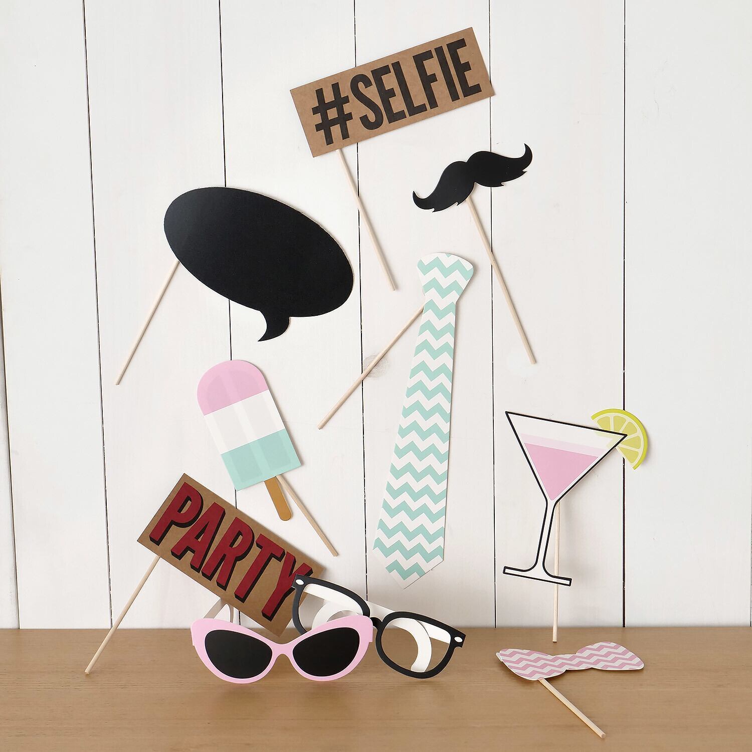 フォトジェニックな1枚が撮れること間違いなしのフォトブースプロップス。バラエティ豊かなモチーフを10点セットでお届けします。結婚式のフォトブースに置いておけば、ウィットに富んだ写真が撮れることでしょう。