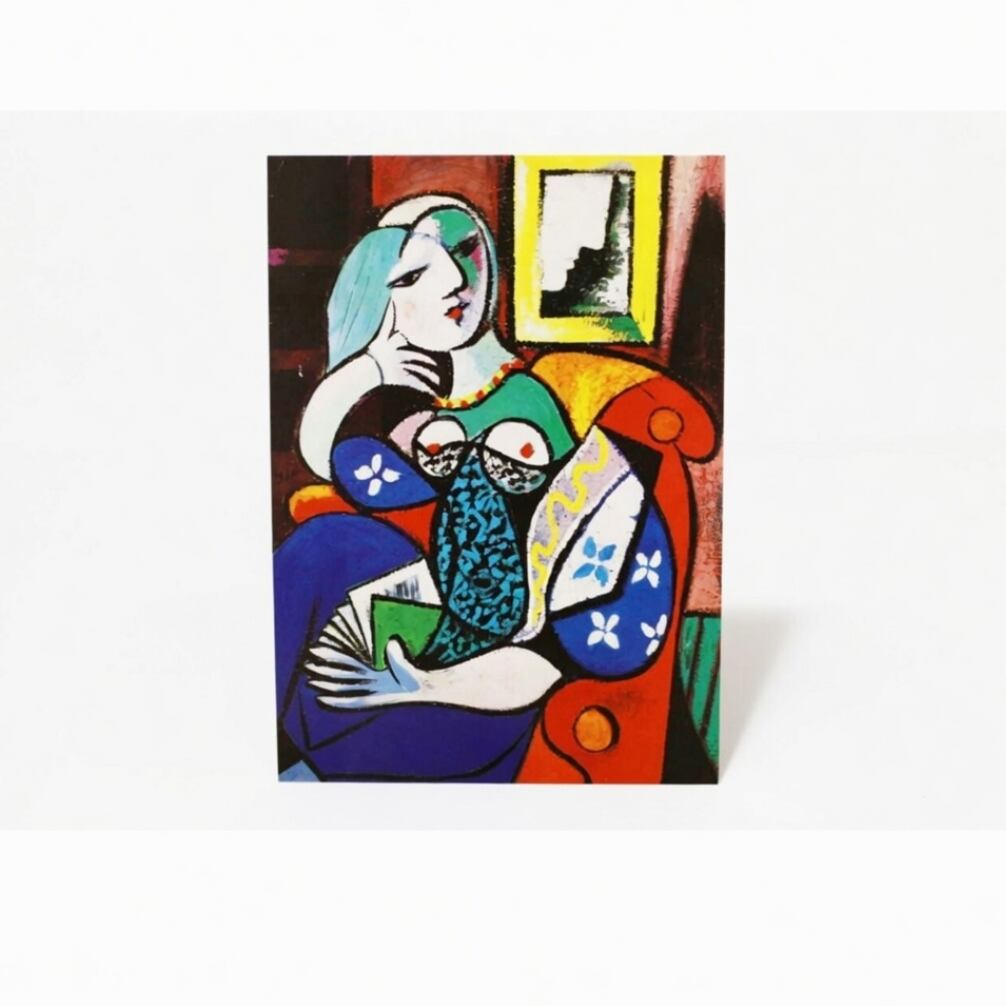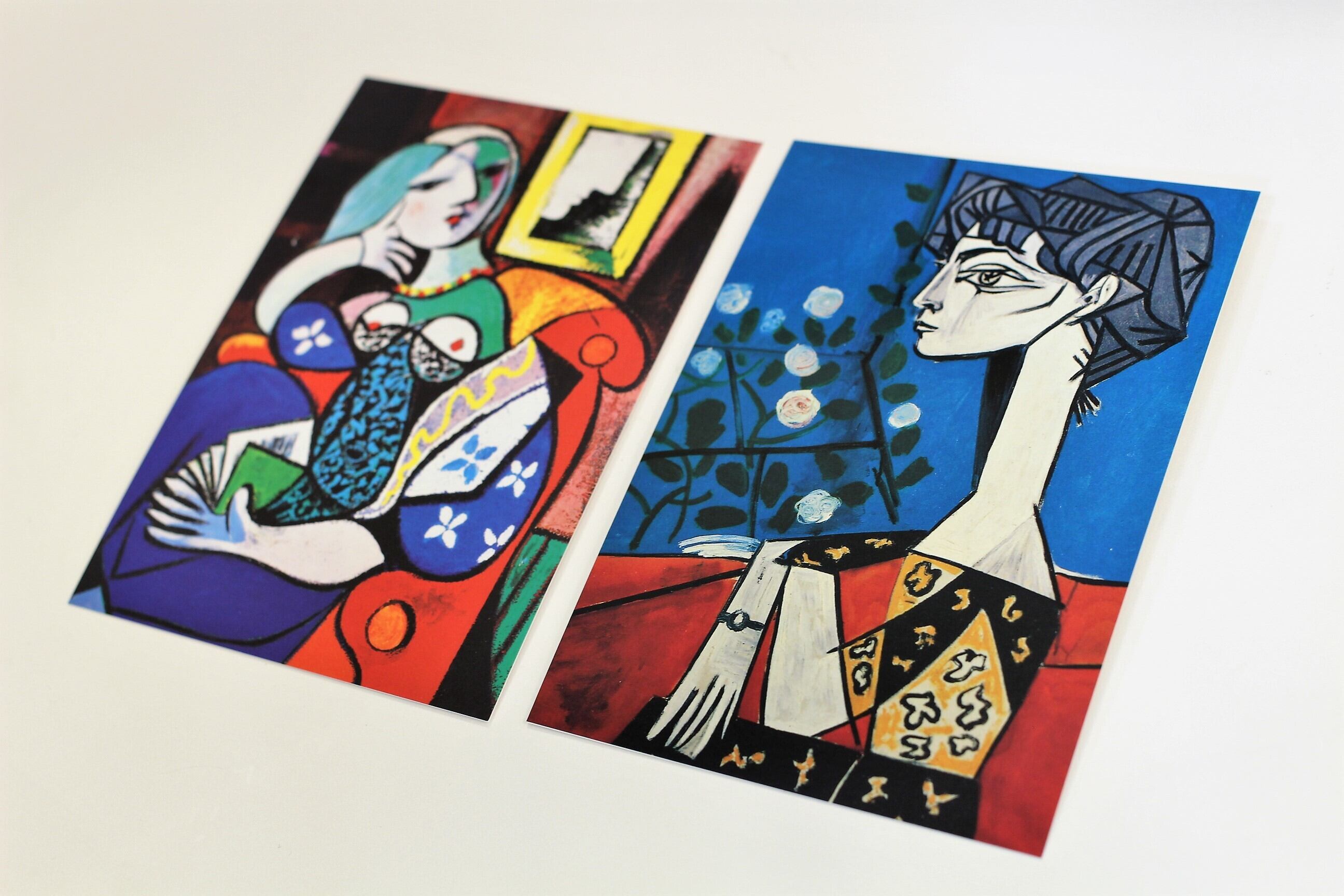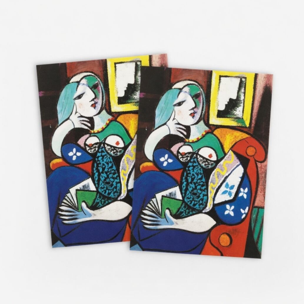 ピカソの名作『本を持つ女性』をモチーフにしたポストカードの2枚セットです。印象的なデザインが、あなたのメッセージを一層引き立てます。